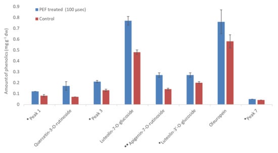 Amount of phenolics (mg g−1 dw) in PEF treated leaves versus control at 100 μs pulse duration and 25% EtOH. * Luteolin-3′-O-glucoside and peaks 1, 3 and 7 were quantified as luteolin-7-O-glucoside; ** Apigenin-7-O-rutinoside was quantified as apigenin.