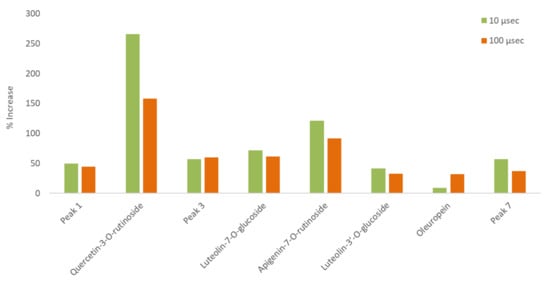 Comparing the extraction efficiency between the set of PEF conditions utilizing pulses of 10 and 100 μs, the 10 μs pulses showed better performance in the extraction of phenolics. It is obvious that PEF treatment has a remarkable positive effect in the recovery of these compounds, reaching an increase of up to 265.67%. The above observations are illustrated comparatively in Figure 9 and Figure 10 (in 25% EtOH), and confirm an adequately reported observation of a short-duration pulse disintegration effect on the membranes and intracellular compounds extraction rate from vegetable cells. Looking at the above figures, it can be concluded that the pulse time affects the extraction and probably has to do with the structure of the molecules being extracted. For compounds such as phenolic glycosides, where the molecule usually comprises one or two sugar units bound to a flavone-backbone (quercetin), the time of 10 μs gave significantly (p < 0.05) better results for all compounds apart from oleuropein (no significant difference). Concerning oleuropein, the longer time of 100 μs gave significantly (p < 0.05) better results. Looking at the molecular structures, oleuropein is different from other phenolic compounds since it has no flavone backbone and is smaller in size.