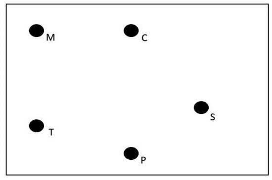 Example of the polarized projective mapping sheet. Fixed poles: M = melon, C = citrus, T = tropical fruit, P = pear, S = stone fruit.