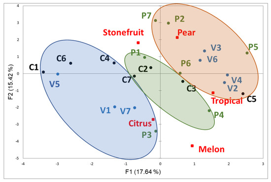 The chosen poles were all fruit aromas associated with young white wines, such as Chardonnay, Pinot Gris and Viognier [3,31,32,33]. They are also fairly distinctive fruit aromas and it was interesting that the tropical fruit and melon poles were placed near each other when poles were included as supplementary variables in MFA. It is worth noting that passion fruit, mango, guava, grapefruit and melon are all considered tropical fruits since they grow in tropical and subtropical regions [34]. However, the volatile composition of these fruits, particularly melon, is quite different, resulting in the perception of diverse tropical fruit aromas [35].