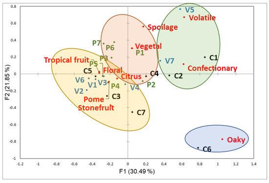 The first three factors of CA explained 52.34% of the variance (F1 = 30.49% and F2 = 21.85%, Figure 4). This figure shows the samples and the projection of the aroma descriptors used to describe them. A total of ten terms were utilized to describe the aroma of the wines (Table S2). While floral and all fruit terms (tropical fruit, stone fruit, citrus and pome) were located in the negative F1 axis, the positive F1 axis comprised non-fruit descriptors, which were used to characterize the aroma of specific wines.
