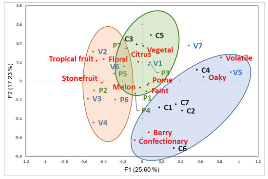 The first two factors of CA explained 42.83% of the variance (F1 = 25.60% and F2 = 17.23%, Figure 5). Twelve terms were used to characterize the wines (Table S3). Most fruit descriptors and the floral term were in the negative F1 axis. The remaining terms were located in the positive F1 axis. The F2 axis showed a clear separation of berry (red and black fruits) and confectionery (candy) from all the other terms.
