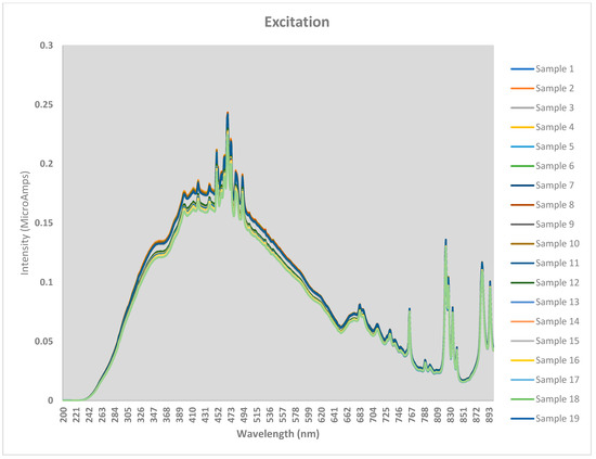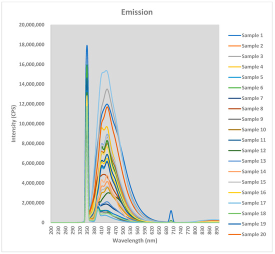 The fluorescence spectra for all thirty baijiu samples were obtained by recording the emission excitation spectrums from 200–900 nm. The spectra for all thirty baijiu samples can be seen in Figure 1 and Figure 2.