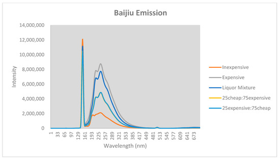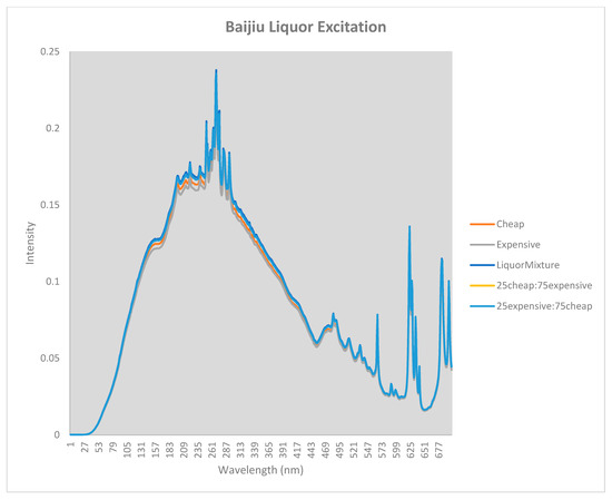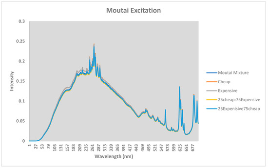 As counterfeiters are looking to maximize profits one of the ways to do this would be to mix an inexpensive baijiu with an expensive baijiu sample. In 2019 a total of forty-seven suspects were arrested in a baijiu scam in Shanghai; the police estimated the scam if sold genuine would have yielded USD 8.5 million [15]. To test the theory of distinguishing different mixtures, an inexpensive baijiu or Moutai sample were mixed with an expensive baijiu or Moutai spirit in a 25:75 mixture. The experiment was carried out in both directions as counterfeiters would still be able to profit if the spirit samples were 75:25 expensive to inexpensive. The different mixtures of Moutai and baijiu spirit were obtained by recording the emission spectrum and excitation spectrum for a series of wavelengths between 200 to 900 nm. As was seen previously the excitation spectra for both types of alcohol of mixtures was indistinguishable, as is shown in Figure 3 and Figure 4.