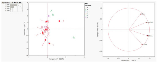 In the PCA model, the first two principal component axes resolve 86% of the total data variance. (Figure 8), the main trend is that the price is more strongly correlated with the emission at 435 nm as these two vectors have a small angle between them. Site location B had the two samples with the highest price as well as the samples with the highest emission spectra at 435 nm. On the opposite end of the score plot was site location E which was one of the lower priced samples.
