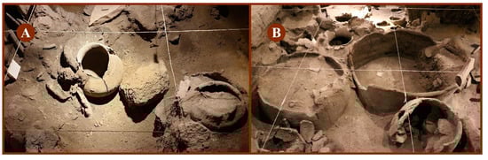 The wine-making facility was evidenced by the discovery of a clay basin (aragast) with a clearly visible slope for treading grapes and a pressed clay container (taqar) for collecting the mash and/or grape juice on the floor. In addition, numerous vessels of various sizes were excavated for sediment separation, wine storage, and maturation [9,10,11]. During the “winemaking process”, fresh grapes were trodden into the aragast, probably with bare feet. This shallow basin (1 m long) was made of hard clay surrounded by a thick rim to contain the juices, which flowed by gravity into the buried taqar (at 60 cm deep, with a capacity of about 55 L) for fermentation and storage. Some of the pots were covered with lids made of stone slabs, while the mouths of others were covered with clay, preserving traces of fingerprints well for such a long time. The plastering of the jar mouths would have created an air lock, while the constant low humidity and stable temperatures in the cave aided the preservation of the wine [9]. The size of the clay fermentation vessels strongly resembles those still found in the region today and can be considered as precursors of the Greek pithoi [12], Roman dolia [13], Armenian karases [14], Georgian qvevri [15], or Portuguese talhas [16].