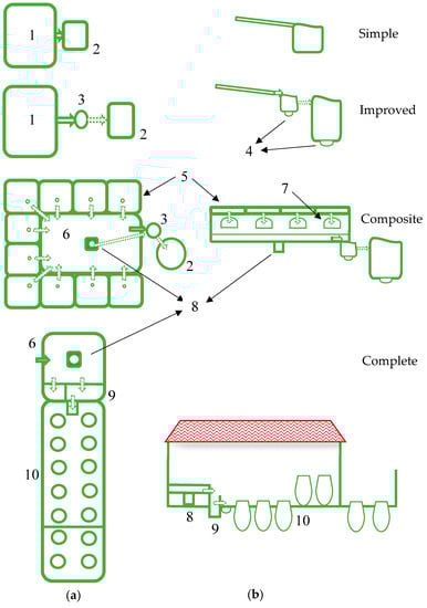 Schematic representation of the various structural typologies of wine production installations: (a), horizontal sections; (b) vertical sections) (1, treading floor; 2, juice collecting vat; 3, Intermediate vat; 4, sedimentation pits; 5, grape drying upper floors with holes; 6, treading and pressing floor (in separate sections or not); 7, vaulted compartments; 8, press base; 9, juice collecting vats; 10, clay vessels). Arrows indicate grape or juice flow (solid arrow, surface flow; dashed arrow, channeled flow).