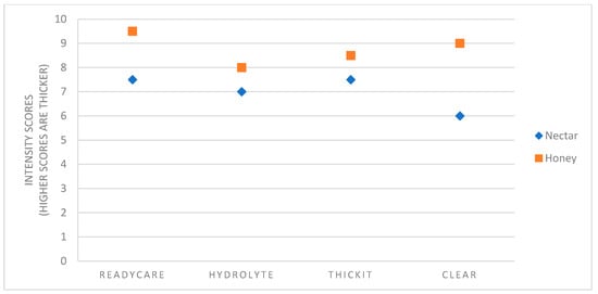 The different viscosity for the nectar-like and honey-like consistency was clearly detectable to panelists; nectar-like products had lower sensory perceived viscosity than honey-like consistency products (Table 3). Additionally, there was a difference between the viscosity of products within the same thickness category (nectar-like or honey-like). The Thick&Easy Clear had the biggest difference between the nectar-like and honey-like consistency while Thick&Easy Hydrolyte and Thickit had the smallest. The honey-like consistency of the ReadyCare had the highest viscosity in all products when the nectar-like consistency of the Thick&Easy Clear had the lowest viscosity.
