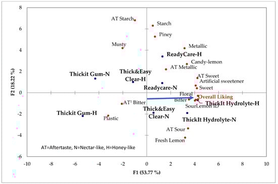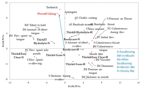 The in-mouth viscosity is located in the opposite direction of overall liking (Figure 3), as is slickness in the mouth and throat. This may indicate that viscosity did not have a positive impact on consumers’ liking and, in fact, may have negatively affected liking. Of course, the negative issue could be slickness or a combination of increased slickness and thickness. The result for thickness did not align with a consumer study that indicated beverages with thicker textures were liked more [17].