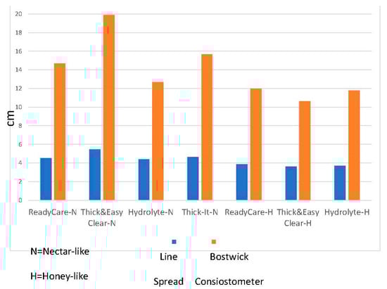 Physical flow data were collected to be compared with the sensory thickness data. Mean values for line spread were less than 4.0 for honey-thick samples and approximately 5 for nectar-like thickness (Figure 4), with standards deviations (SD) less than 0.2 for all samples. Similarly, mean values for Bostwick flow distances were 12–20 for nectar-like samples and 10–12 for honey-like samples with SD less than 0.6 for all samples except Hydrolyte nectar, which was 1.6. The flow (centimeters) measured with the Bostwick test and the LST were positively correlated (r = 0.97, p < 0.05) and both, as expected, were inversely correlated with viscosity scores from the descriptive panel (Bostwick, r = −0.81, p < 0.05 and line spread, r = −0.85, p < 0.05). The results clearly show that as flow distance increased, as measured by the physical measurements, sensory viscosity scores decreased. That is, the thinnest products measured instrumentally were also the thinnest products as measured sensorially. This suggests that for thickened liquids, the measurement of human perceived viscosity can be closely estimated using simple tools that measure flow. In addition, because many of the measurements associated with texture of liquids correlate highly with viscosity as shown in this study and in prior research [20] many other textural characteristics can be estimated using the same tools.