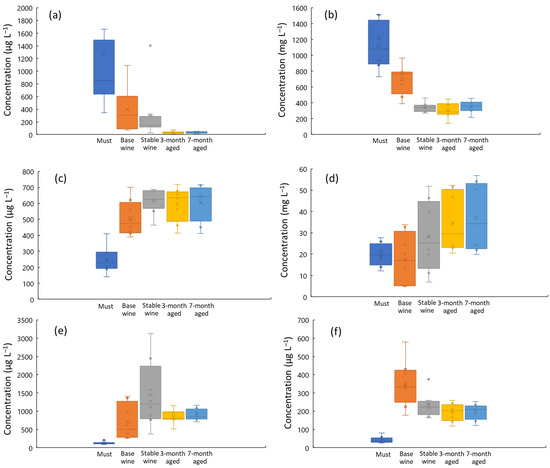 After the clarification, the base wine is stabilized in cold at –2.5 °C through the precipitation of an excess of tartaric acid in musts in form of potassium bi-tartrate and calcium tartrate in the case of qualities B, C, and D in both grape varieties. Quality A is stabilized using the electrodialysis methodology to extract only the ions Ca and K and preserve the maximum quantity of the natural tartaric acid which came from the own grape. This process agreed with the noticeable decrease in K content from base wines to the stabilized ones (p = 0.037). In the case of S, the rise from the must to the base wine is due to the addition of SO2 to prevent undesired reactions dealing with the activity of some microorganisms such as acetic bacteria. Subsequently, S content decayed in stabilized wines because of its progressive volatilization before the second fermentation. It is important the SO2 concentration due to second fermentation does not work properly with values of free SO2 higher than 25–30 mg L−1. The remarkable change in S levels was also confirmed statistically (p = 6.5 × 10−9). The influence of other additives on the elemental composition is more difficult to explain due to some confidentiality issues. Anyway, contents of Mn, Na, Fe, Ti, or V clearly varied from must to wine stages (see Figure 1c,d for Mn and Fe; the same behavior was exhibited by the other elements), and these changes were always statistically sound (p < 0.0012 at least).