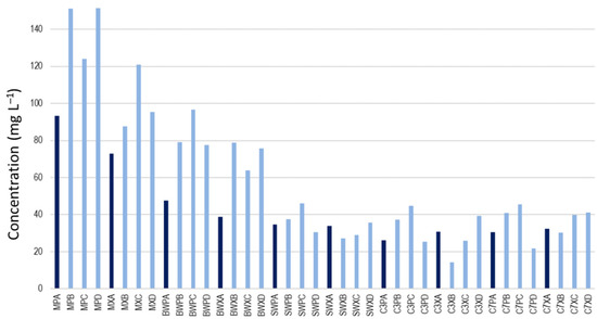 Apart from changes in the elemental composition depending on the sample type, other patterns dealing with the influence of product quality on the concentration of some elements were also encountered. For instance, a clear difference among the elemental composition of samples of the highest quality (A samples) and lower qualities (B, C, and D samples) was observed. As shown in Figure 2, A quality displayed lower contents of some elements such as K. This finding was attributed to conditions for the production of wines and cavas of A quality, in which a soft pressing was applied to obtain the must, and was statistically proven (p = 0.0036). In contrast to the much higher pressures (ca. 40–45% higher) applied to the other qualities. Thus, under mild pressing conditions, potassium, calcium, and other minor cations are not so efficiently extracted so that their concentrations in the A quality musts are lower. Moreover, in further vinification steps, the base wines of higher qualities are treated by electrodialysis before the tirage to remove the maximum possible amount of these ions, while those of lower qualities do not follow this procedure. Other elements such as Fe, Mg, Mn, Na, Ni, V, and Zn followed an analogous behavior regarding the difference between the top quality (A samples) and the others (B, C, and D). The significance of these findings was statistically verified (e.g., Na, p = 1.1 × 10−6; V, p = 3.2 × 10−4; Fe, p = 0.0025; Mn, p = 0.016).