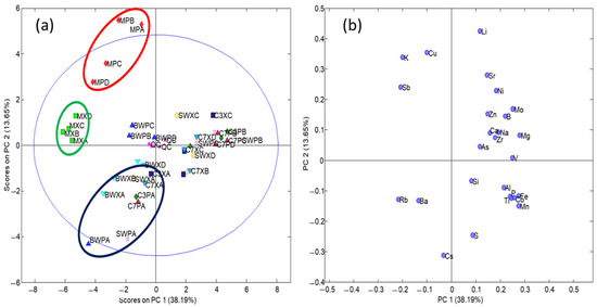 The interpretation of the plot of loading of PC1 vs. PC2 revealed that Cu, K, and Sb were in high concentrations in the musts, and their concentrations progressively decreased in the following stages, from base wines to stabilized wines and sparkling wines aged for 3 and 7 months in rhyme (see Figure 3b). In contrast, musts have low concentrations of Al, Fe, Mn, S, and Ti (some of these patterns were statistically confirmed as given in Section 3.1). Both musts and base wines have low concentrations of Na, V, and Zr. Regarding to product quality, the concentrations of K, Mg, Mn, Ni, Sr, and Zn in the best wines and cavas were lower than in the rest of the qualities. It was also inferred that Ba and Cs were richer and quite characteristic of Pinot Noir samples of high quality.