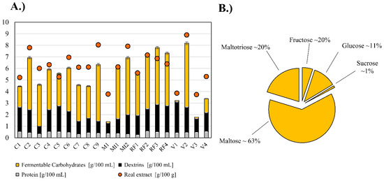 (A) The composition of protein, dextrins. and fermentable carbohydrates and their relationship to residual extract. (B) The average percentage for each individual fermentable carbohydrate (i.e., maltose, maltotriose, fructose, sucrose, and glucose) contribute to the total fermentable carbohydrate profile amongst the different NABs. Error bars are calculated for each measurement and represent 2 × the reported %RSD.