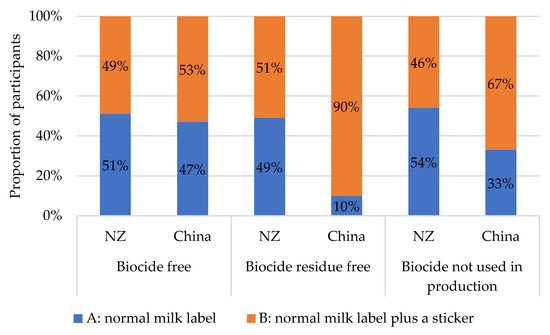 Chinese participants only slightly preferred the “biocide free” label (53%) or the “biocide not used in production” (67%) label (Figure 3), as some participants understood the importance of biocides being used in the production process—“I choose A. As far as I know, biocides must be used in milk products. Label of product A indicated nothing about biocides. But I tend to think that biocides have already been used to remove bacteria of product A. Label on product B indicated “biocide free”, it is quite weird for me to see this label.” (CNFG2, Role 7). Interestingly, Chinese participants (90%) preferred the label containing the wording “free”, as stated by the following quote: “When we choose milk product, “free” on label of one product will leave favourable impression on consumers. Consumers tend to believe this product is quite safe.” (CNFG3, Role 2).
