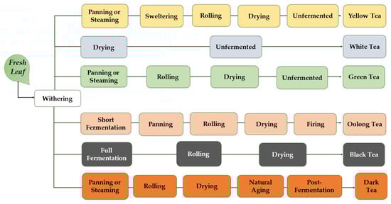 Tea production starts with leaf collection, which then undergo processing. During the transformation phases, tea leaves undergo oxidative and hydrolysis processes due to endogenous enzymes (e.g., polyphenol oxidase and peroxidase) in leaf cells [5]. Depending on the level of fermentation and processing methods, it is possible to distinguish between six main kinds of tea (Figure 1): yellow, white, and green tea (non-fermented), oolong tea (semi-fermented), black tea (fully fermented), and dark tea (post-fermented) [6,7]. In green tea, the leaves are rolled and steamed to inactivate polyphenol oxidase, thus reducing oxidation before drying; while, in black tea production, leaves are rolled to allow the rupture of cellular constituents, thus facilitating contact between phenolic compounds and polyphenol oxidase.