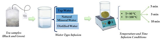 Individual preferences for the consumption of tea change according to the country of origin. Generally, tea is usually consumed after an infusion in water between 95 °C and 100 °C for a determined time [23]. In Western countries, the consumption of bagged black tea leaves after a short infusion time (<3 min) in water at 100 °C is preferred. In India, Pakistan, and some Middle Eastern Countries, black leaves are boiled in a pot for longer before consumption. In China and Japan, tea is prepared by steeping green leaves in hot, not boiling, water, and only the second and subsequent infusions are consumed [23]. Therefore, although the procedure for preparing tea is not the same worldwide, it is essential to keep its active principles intact. To deepen the beneficial effects derived from tea consumption in the laboratory setting, it is essential to understand how the total polyphenol content varies when varying the kind of water used for the infusion and the temperature/time conditions. Currently, most research focused on steeping times often used by consumers reported that over 50% of polyphenols were released in the initial 5 min of infusion time [8,24]. Studies have only investigated a few steeping times, such as an extended timeframe (e.g., beyond the first 5 min of infusion), or have only examined a specific type of tea at a fixed temperature [23,24,25].