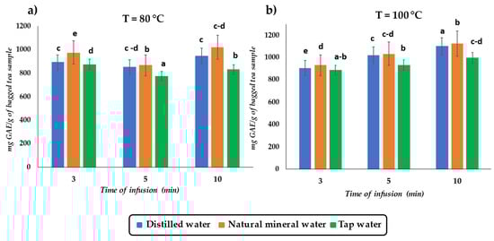 Total phenolic content (TPC) in black tea samples (mg GAE/g). (a) TPC for black tea infusion at T = 80 °C for different infusion times and different types of water; (b) TPC for black tea infusion at T = 100 °C for different infusion time and different types of water. Error bars are ±standard deviation. Same letters indicate a significant difference according to the ANOVA test (p < 0.05).