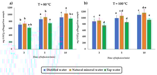Total phenolic content (TPC) in green tea samples (mg GAE/g). (a) TPC for green tea infusion at T = 80 °C for different infusion times and types of water; (b) TPC for green tea infusion at T = 100 °C for different infusion times and types of water. Error bars are ± standard deviation. Same letters indicate a significant difference according to the ANOVA test (p < 0.05).