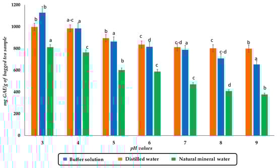 TPC of green tea infusion (mg GAE/g) prepared at different pH values between 3 and 9, in distilled water; in buffer solution, and in natural mineral water at 100 °C for 10 min. Error bars are ±standard deviation. Same letters indicate a significant difference according to the ANOVA test (p < 0.05).
