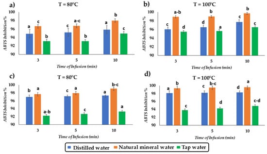 ABTS radical scavenging activity of green tea infusion, at T = 80 °C (a) and at T = 100 °C (b); and of black tea samples, at T = 80 °C (c) and at T = 100 °C (d); in distilled water; in natural mineral water, and in tap water. Error bars are ±standard deviation. Same letters indicate a significant difference according to the ANOVA test (p < 0.05).