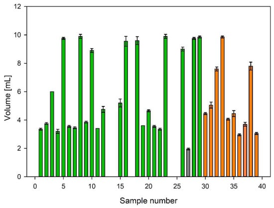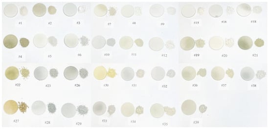 Figure 4. All bentonites were used in their commercial form, which is an important detail since some preparations are sold as a fine powder while others are used in a granular form. The desiccant bentonite (#27) serves as a negative control here due to the gravel-like texture, which does not show any physical swelling in water. In fact, as the only product, 1 g of this bentonite retains its volume of approximately 2 mL throughout the experiment.