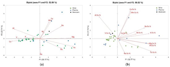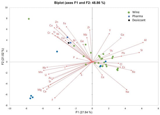 Interestingly, the bentonites cannot be distinctly grouped based on their intended use. The assumption that only bentonites of a specific origin and composition would be used in a product such as wine that is made for human consumption is not supported by the data. There is a larger grouping of wine-related bentonites around the center of the graph, leaning towards aluminum and sodium, but the group is not distinctly different from the healing clay products. The vectors that describe the elements found in bentonite are also spread fairly equally around the axes, which is an indication that the variability between products is fairly large and most likely based on the geographic origin and the pretreatment by different manufacturers. This observation is supported by previous studies [
