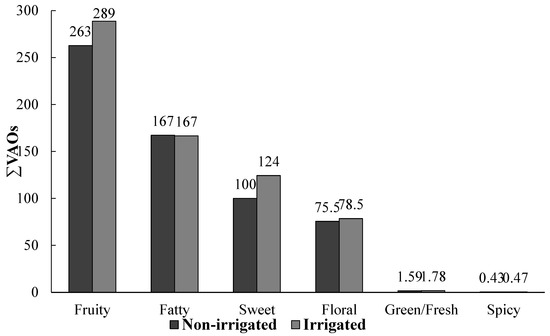 The total intensities of every aromatic series were calculated as the sum of the OAVs of each of the compounds assigned to this series, and the results are graphed in Figure 1. The intensity patterns in the categories suggest that the major aroma characteristics of these wines would consist of fruity, fatty, sweet and floral, regardless of the irrigation on the vine.