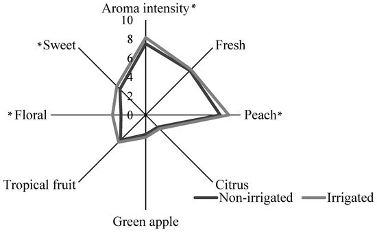 Mean scores of aroma sensory profile of Chelva wines made with grapes from irrigated and non-irrigated vines. * Statistical differences at the 0.05 level according to the ANOVA.
