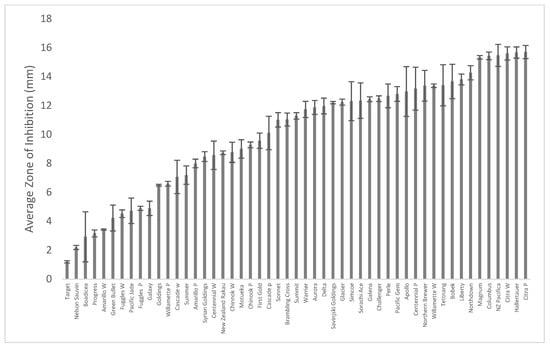 We analysed all hop extracts (n = 50) against M. bovis BCG. The least active hop extract was determined to be Target whole hop (Average zone of inhibition 1.2 mm (+/− 0.08 mm)) whilst the greatest effect was observed to be Citra pellets (15.7 mm (+/− 0.45 mm)). It was interesting to note that all hops exhibited some form of inhibitory effect against the test bacterium (Figure 1).