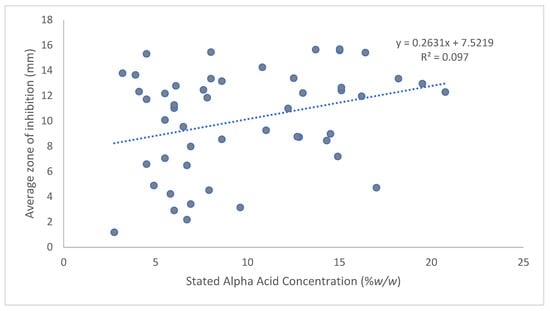 Previous studies [,] have suggested that the alpha acid content is linked to antibacterial activity, in Figure 2 the alpha acid content (as determined by the supplier) was plotted against the average zone of inhibition.