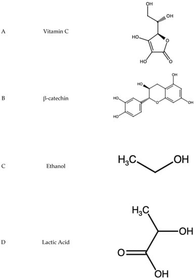 Several chemical structures for example compounds found in kombucha including: (A) vitamin C, (B) β-catechin, (C) ethanol, (D) lactic acid, (E) glucuronic acid, and (F) caffeine.