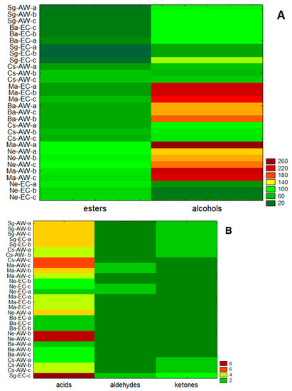 According to Figure 1, reporting the two-way joining run for esters and alcohol (Figure 1A) and acid, ketones and aldehydes (Figure 1B) produced in the different samples (3 independent repetitions for each considered must and strain), the amount of molecules detected was different according to the S. cerevisiae strain used and the must employed. Alcohols and esters were produced in a range between 20 and 200 equivalent ppm while acids, aldehydes, and ketones were present in a range between 2 and 8 ppm. The most abundant alcohols were detected in wines obtained from Magliocco (Ma), independently from the strain applied, and in wines produced from must Negroamaro (Ne), fermented with S. cerevisiae AW. On the contrary, samples from Negroamaro fermented with S. cerevisiae EC were characterized by a lower number of alcohols. Regarding esters, the highest production was found in samples from must Magliocco fermented with AW and must Negroamaro fermented with both the strains. Regarding acids, the major production was observed in samples from must Negroamaro and must Sangiovese (Sg) produced with S. cerevisiae AW and EC, respectively. Aldehydes and ketones were detected in lower amounts with respect to acids, especially in Magliocco and Barbera (Ba) fermented with S. cerevisiae EC and Barbera and Negroamaro fermented with strain AW.