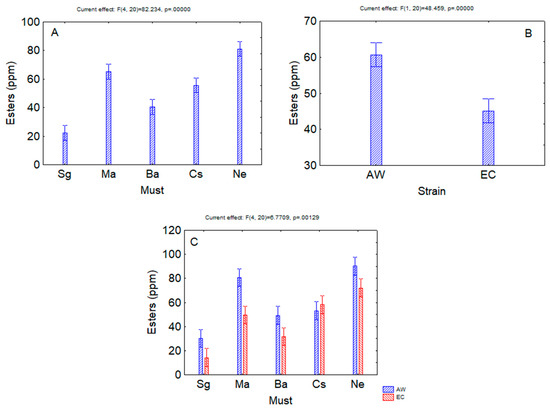 More specifically, in Figure 2 the decomposition of the statistical hypothesis for the effects of must (2A), strain (2B) and interaction must × strain (2C) on the total amount of esters is reported. The wines obtained from musts Negroamaro and Magliocco were the samples most affected (2A) from the three variables for ester production and in general S. cerevisiae AW was a higher producer of ester compounds (2B, 2C) compared to strain EC in all the samples considered except for must Cs.
