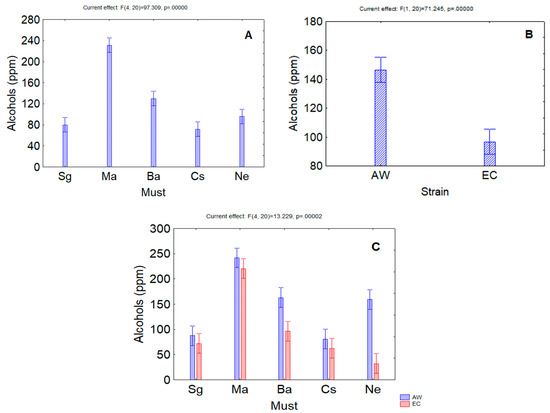 The predictor must affected the samples obtained by the fermentation of Magliocco (Figure 3A), while the influence of the strain S. cerevisiae AW on the alcohol production was higher compared to strain EC (Figure 3B). The effect of the interaction was significant in Negroamaro, where the strain AW produced a higher number of alcohols (170 vs. 30 ppm) (Figure 3C).