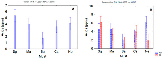 Decomposition of the statistical hypothesis for the effects of must (A), and interaction must × strain (B) on the total amounts of acids. Bars denote 95%-confidence intervals. Sg, Sangiovese; Ma, Magliocco; Ba, Barbera; Cs, Cabernet-Sauvignon; Ne, Negroamaro. EC, strain EC1118; AW, strain AWRI796.