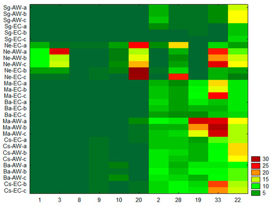 Two way-joining run on some selected esters (ppm). Sg, Sangiovese; Ma, Magliocco; Ba, Barbera; Cs, Cabernet-Sauvignon; Ne, Negroamaro. EC, strain EC1118; AW, strain AWRI796. 1: ethyl undec-10-enoate; 2: 3-methylbutyl acetate; 3: [(2E)-3,7-dimethylocta-2,6-dienyl] acetate; 8: methyl non-7-ynoate; 9: 2-phenylethyl acetate; 10: 3-hydroxy-2,2-dimethoxypropyl acetate; 19: ethyl decanoate; 20: ethyl dodecanoate; 22: ethyl acetate; 28: ethyl hexanoate; 33: ethyl octanoate.