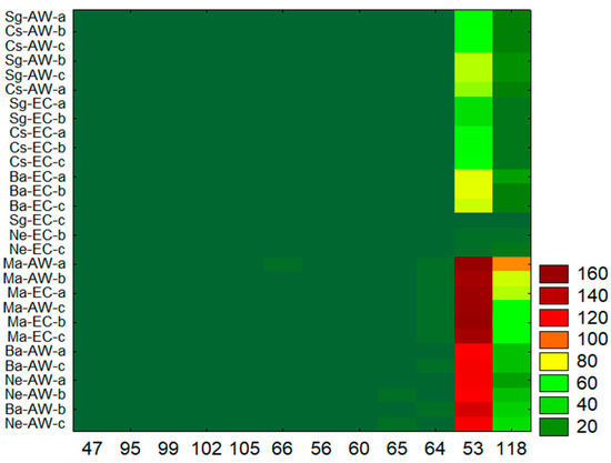 Two way-joining run on some selected alcohols (ppm). Sg, Sangiovese; Ma, Magliocco; Ba, Barbera; Cs, Cabernet-Sauvignon; Ne, Negroamaro. EC, strain EC1118; AW, strain AWRI796. 47: 2-methylbutane-1,3-diol; 53: 3-methylbutan-1-ol; 56: hexan-1-ol; 60: propan-1-ol; 64: 2-methylpropan-1-ol; 65: 2-methyl-2-nitropropan-1-ol; 66: 3-methylsulfanylpropan-1-ol; 95: 3-methylhexan-3-ol; 99: 4-(methoxymethoxy)-3-nitropentan-2-ol; 102: 5-methylsulfanyl-3H-1,3,4-thiadiazole-2-thione; 105: [2-(2-aminopropoxy)-3-methylphenyl] methanol; 118: 2-phenylethanol.