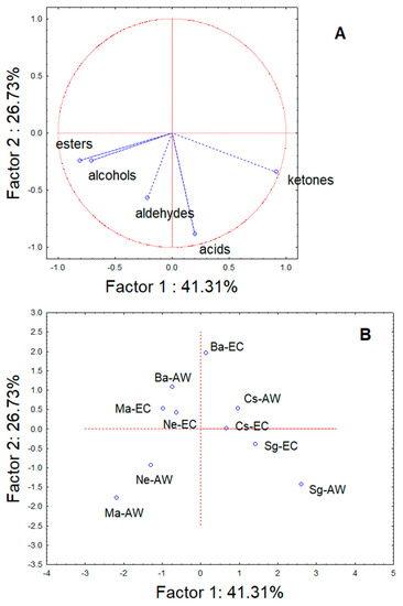 Principal component analysis run on the total amounts of esters, alcohols, acids, aldehydes, and ketones. (A) Variable projection; (B) case projection. Sg, Sangiovese; Ma, Magliocco; Ba, Barbera; Cs, Cabernet-Sauvignon; Ne, Negroamaro. EC, strain EC1118; AW, strain AWRI796.