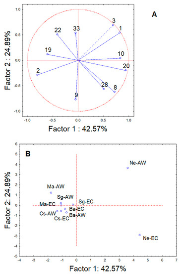 Principal component analysis run on some selected esters. (A) Variable projection; (B) case projection. Sg, Sangiovese; Ma, Magliocco; Ba, Barbera; Cs, Cabernet-Sauvignon; Ne, Negroamaro. EC, strain EC1118; AW, strain AWRI796. 1: ethyl undec-10-enoate; 2: 3-methylbutyl acetate; 3: [(2E)-3,7-dimethylocta-2,6-dienyl] acetate; 8: methyl non-7-ynoate; 9: 2-phenylethyl acetate; 10: (3-hydroxy-2,2-dimethoxypropyl) acetate; 19: ethyl decanoate; 20: ethyl dodecanoate; 22: ethyl acetate; 28: ethyl hexanoate; 33: ethyl octanoate.
