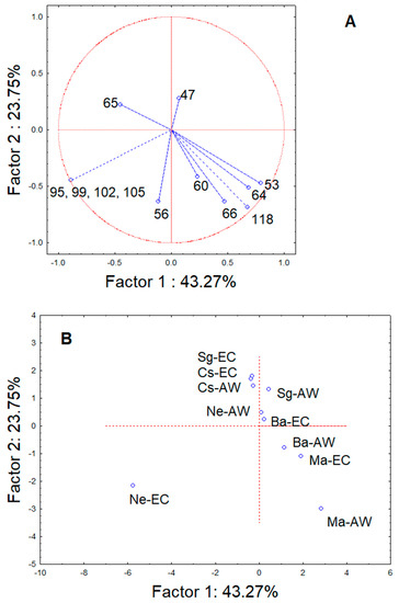 Principal component analysis run on some selected alcohols. (A) Variable projection; (B) case projection. Sg, Sangiovese; Ma, Magliocco; Ba, Barbera; Cs, Cabernet-Sauvignon; Ne, Negroamaro. EC, strain EC1118; AW, strain AWRI796. 47: 2-methylbutane-1,3-diol; 53: 3-methylbutan-1-ol; 56: hexan-1-ol; 60: propan-1-ol; 64: 2-methylpropan-1-ol; 65: 2-methyl-2-nitropropan-1-ol; 66: 3-methylsulfanylpropan-1-ol; 95: 3-methylhexan-3-ol; 99: 4-(methoxymethoxy)-3-nitropentan-2-ol; 102: 5-methylsulfanyl-3H-1,3,4-thiadiazole-2-thione; 105: [2-(2-aminopropoxy)-3-methylphenyl] methanol; 118: 2-phenylethanol.