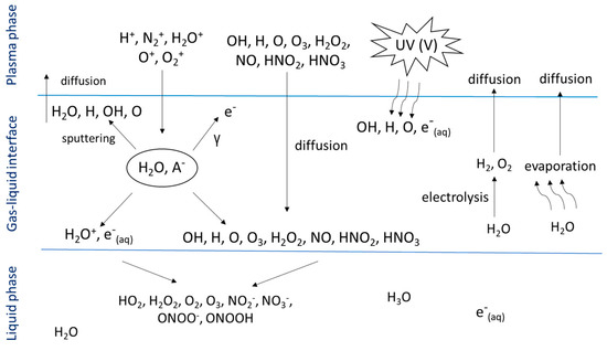 Plasma activated water is water treated with plasma, which is produced above the water column, in water or gas bubbles present in water [18]. Reactive molecules formed in the gas phase penetrate the plasma-liquid interface into water (Figure 1), inducing secondary reactive species in solution. The transfer of reactive species from plasma to the liquid consists of numerous physical and chemical processes, including mass transfer, molecules collision, liquid evaporation, sputtering, and ultra-violet radiation [19].