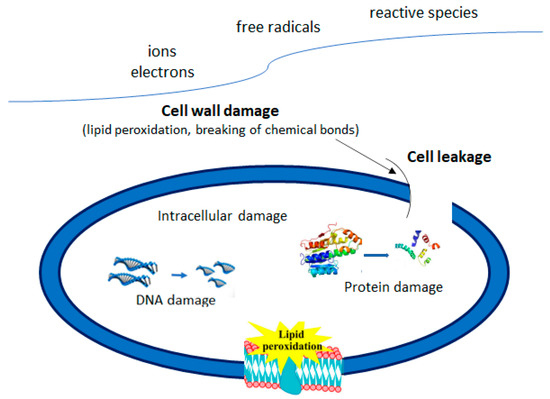 Plasma-activated water shows antimicrobial effectiveness, which is associated, among others, with the presence of reactive oxygen species, reactive nitrogen species, and hydrogen peroxide [41]. The formation of countless numbers of these active chemical compounds, combined with physical factors (low pH, high redox potential), has an antimicrobial effect. The destructive effect of PAW in relation to microorganisms is explained by the mechanisms taking place in various areas of the cell—damage to the cell wall, cytoplasmic membrane, DNA and enzyme apparatus (Figure 2). Observations in the scanning electron microscope(SEM) indicate that the action of plasma-activated water on cells damages their external structures. Changes in bacterial morphology after PAW treatment have been observed in SEM images by many authors [42,43,44]. The smooth surfaces of the cells distort, shrink, and rupture. The surface structures—the cell wall and membrane—are disintegrated. Reactive forms present in the PAW collide with microorganisms, causing serious and difficult to repair damage to the cell membrane. As a consequence, they may lead to a break in its continuity. This effect may also result from the accumulation of electric charge on the outer surface of the cell membrane. In this process, according to the authors, atomic oxygen and hydroxyl radicals have the greatest lethal effect [45]. A similar effect is obtained as a result of electroporation, otherwise known as electropermeabilization. This process involves the electrically induced formation of new microspores in the cell membrane and the growth of existing ones. The destructive action of this mechanism, described on the example of Salmonella enterica and Listeria monocytogenes, consists in increasing the permeability of the cell’s cytoplasmic membrane. This directly affects the transmembrane potential of cells and their ability to regulate intracellular pH [46].
