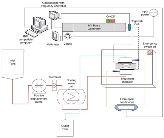 A continuous laboratory-scale PEF system designed and constructed at the University of Auckland [24] was used in this study as illustrated in Figure 1. The system includes a high-voltage pulse generator, continuous treatment chamber, data acquisition systems, fluid handling system, voltage and current devices, and cooling system. The design of the unit yields high efficiency in terms of microbial inactivation and energy saving [25].