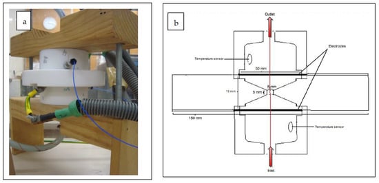 The novel treatment chamber (Figure 3a,b) included in the PEF system was designed where high electric field intensities of up to 50 kV/cm can be generated. The treatment chamber consisted of two mesh electrodes made of 316 food grade stainless steel. The diameter of the treatment zone was 8 mm, and the depth was 5 mm. Each electrode diameter was 50 mm, and the distance between electrodes was fixed at 15 mm. The area between the electrode and the treatment chamber was made of insulator material. The fluid flowed through the openings of the mesh electrodes. The two electrodes were electrically isolated from each other by an insulator element, designed to form a small orifice where most of the electric field was concentrated. A dielectric breakdown inside the treatment chamber was prevented by removing the electrodes far from the narrow gap.