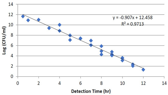 One loop (one smear taken from the culture using an inoculation loop/microstreaker) of freshly grown and washed cells was then re-suspended in 50 mL of the diluted protein shake beverage, mixed using a vortex, and left for five minutes at 4 °C for serial dilutions. The BacTracTM microbial analyzer was used for the microbial count, based on impedance analyses. The microbial metabolism utilizes nutrients and produces lower molecular compounds, which alter the conductivity of the liquid nutrients. This change can be technically measured using two electrodes placed in the nutrient solution. When an electrical AC voltage is applied to the electrodes, the reduction in the solution impedance in the AC current field can then be measured. The calibration curve of the microbial analyzer was generated according to the procedure previously described by Alkhafaji (2006) [24]. One milliliter of the original inoculum and each dilution tube was transferred into duplicate 3M Petrifilms™ for a viable count and into BacTrac pre-filled (9 mL) vials for the electrical measurement of the detection time. The original detection time was recorded for duplicate samples and the average was calculated. The number of log microbes was then obtained from the corresponding averaged duplicate 3M Petrifilms™ count as the reference method. The calibration curve is illustrated in Figure 4.