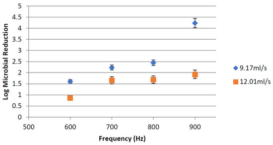 The first set of experiments was conducted to measure the effect of using two different flow rates (9.17 and 12.01 mL/s) at 25 kV/cm on E. coli viable counts. As expected, decreasing the flow rate of the diluted beverage resulted in a higher E. coli inactivation (Figure 6). The highest E. coli reduction rate of 4.2 log was achieved at a higher frequency (900 Hz) and a lower flow rate (9.17 mL/s), corresponding to a treatment time of 37 μs, where the outlet temperature was 38.4 °C. For the flow rate of 12.01 mL/s, the highest E. coli inactivation of 1.9 log was also obtained at 900 Hz, corresponding to a treatment time of 28 μs and a 34.9 °C outlet temperature. These results suggest that lower flow rates are recommended for microbial inactivation experiments due to the higher number of electrical pulses the liquid food receives that enhances microbial inactivation, which is mainly due to a longer residence time inside the treatment zone [34].