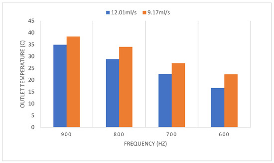 The outlet temperatures using different flow rates and frequencies for a field intensity of 25 kV/cm on the E. coli population suspended in diluted protein shake drink.