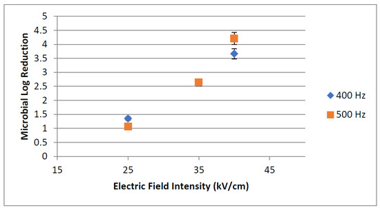 Another set of experiments was also conducted at a constant flow rate of 12.01 mL/s to measure the effect of changing the electric field intensity (25, 35 and 40 kV/cm) on the inactivation of E. coli suspended in diluted protein shake beverage. The frequencies used were 400 and 500 Hz, and the reason for choosing these low frequencies in this study was to maintain the temperature below 45 °C when increasing the electric field intensity (Figure 8).