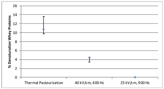 The PEF treatment with an electric field intensity of 25 kV/cm and 900 Hz, at a constant flow rate of 9.17 mL/s, did not denature the protein (0% denaturation) (Figure 9). In contrast, the PEF treatment at 40 kV/cm and a frequency of 400 Hz at the same flow rate showed 4.41% ± 0.008 denaturation, which is close to the results reported by Sharma et al. (1997) [27] (6% denaturation). The heat treatment using 71 °C ± 0.5 for 15 s caused a negative impact on protein (10.75% ± 1.77 denaturation). The thermal denaturation rate was approximately twice as high than the PEF denaturation at 40 kV/cm (4.41%). The PEF treatment at a flow rate 9.17 mL/s, high frequency (900 Hz) and lower field intensity (25 kV/cm) did not denaturize this protein, which suggests that the frequency (37 μs treatment time) does not significantly affect the protein structure, as opposed to the electric field intensity. The results also demonstrate that the PEF treatment, although it induced protein denaturation, was not as harsh as the heat treatment on the protein structure and caused less denaturation than that observed after the heat treatment. The results obtained in this study are in agreement with the findings of Sharma et al. (1997) and Xiang et al. (2009) [27,42]. A lower denaturation of whey protein by the PEF pasteurization method, compared to the conventional thermal pasteurization, might indicate a higher bioavailability of the whey protein solution and ultimately of the protein drink rich in whey protein.